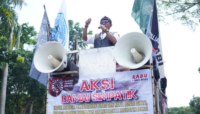 BEKASIVOICE.COM | Cikarang, Puluhan Organisasi Masyarakat yang tergabung dalam Aliansi Ormas Bekasi (AOB) menggelar aksi damai simpatik nyatakan dukungannya terhadap kebijakan Bupati dan Wakil Bupati Kabupaten Bekasi di Depan Pemda Kabupaten Bekasi pada Rabu, (7/5/2025).